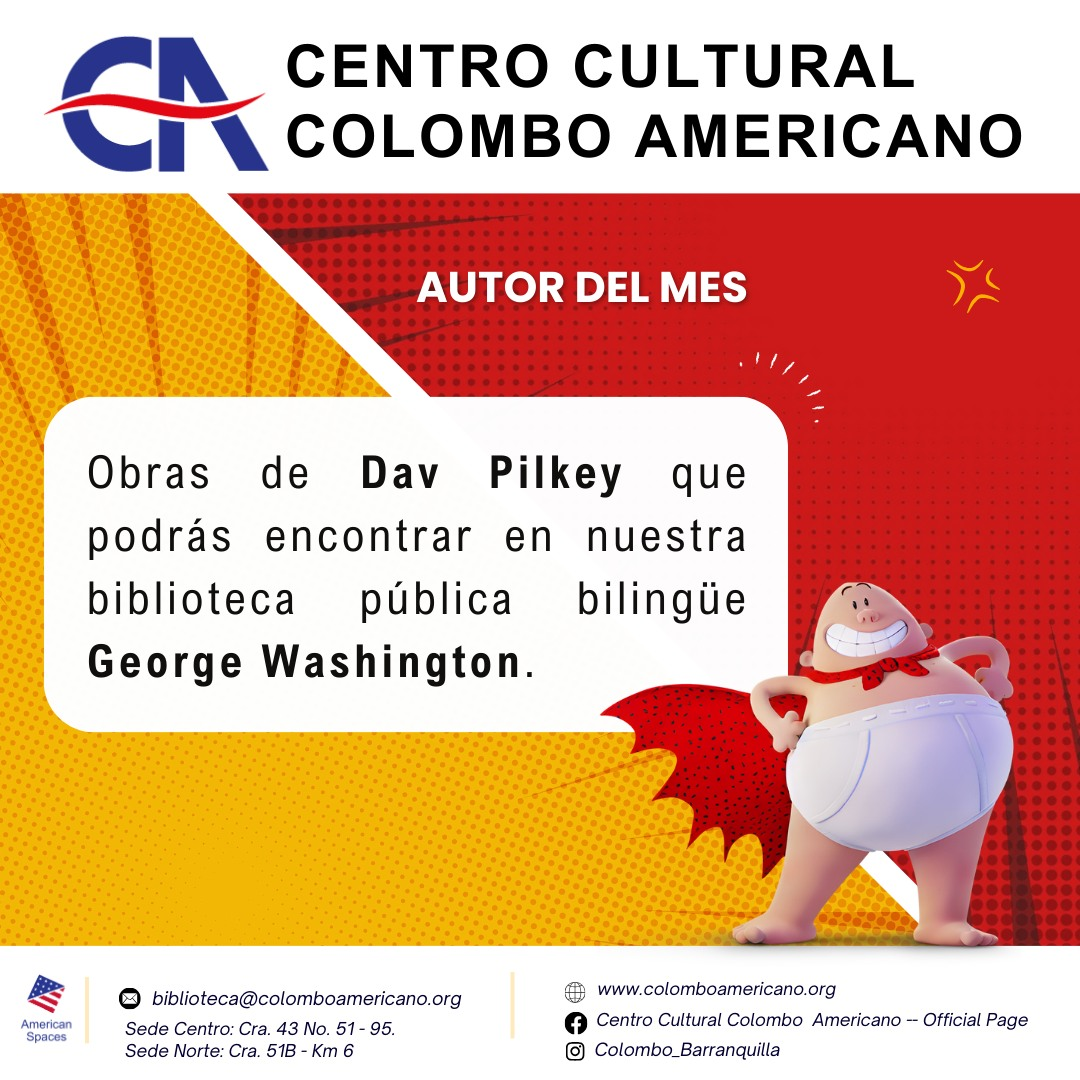 Las obras y el legado literario de Dav Pilkey, quien con sus historias llenas de aventuras, humor y valores ha capturado el corazón de niños y adultos en todo el mundo están al alcance de los amantes de la literatura en la biblioteca pública bilingüe George Washington del Centro Cultural Colombo Americano de BarranquillaCentro Cultural Colombo Americano de Barranquilla para llegar descubrir a este talentoso escritor y disfrutar de una experiencia de única.
